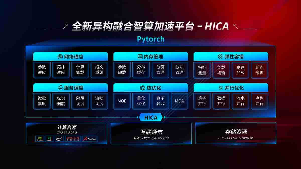 通过自研的服务层、、、中间适配层、、、以及调度编排算法,,,,采用数据并行、、模型并行等多种并行方式,,把并行计算任务进行有效的分解,,,,使其分别由相应的软件栈和算力资源来承接。。。当GPU资源变化,,HICA可以实时动态调度计算子任务并调整模型拓扑和架构,,以充分聚合各种算力资源。。。。