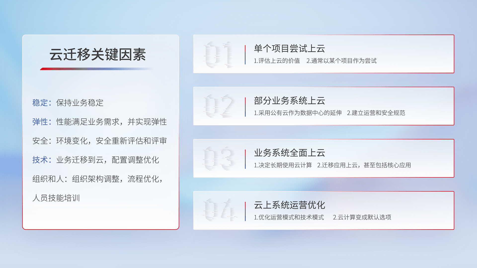 结合实际业务,,,从规划设计、、、、云平台选型、、云原生改造、、、数据迁移、、集成交付,,,,迁移全过程为客户识别最佳上云路径,,做好风险识别管理,,,,设计网络架构、、、身份权限、、、、安全审计合规、、、、操作审计、、日志审计、、、、监控告警策略、、多站点容灾设计等,,,对云上基础设施进行整体规划,,,,提升IT治理水平,,以满足弹性、、、高可用、、、高性能的需求。。。。